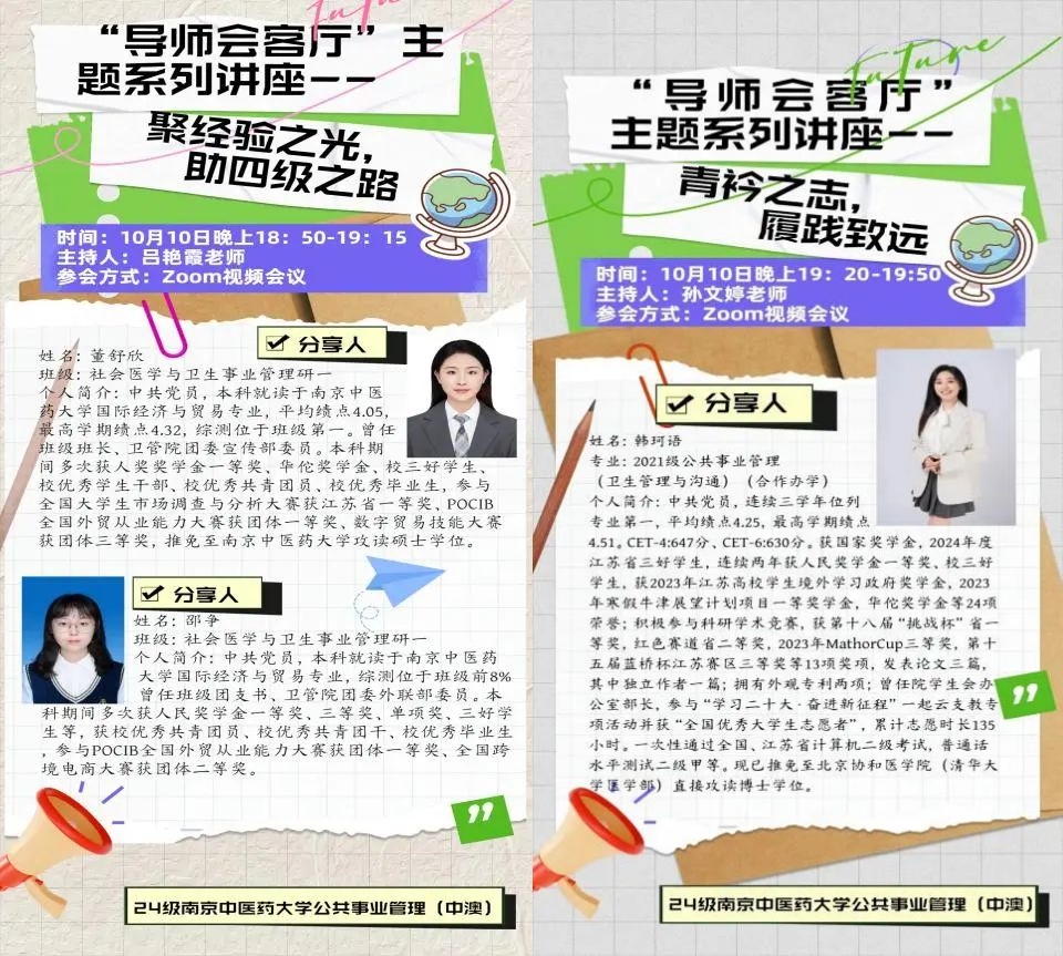 为更好地帮助24级公管专业(中澳合作办学)的同学们增强专业认知、分享学习经验并提升学习信心,best365网页版登录卫生管理系于10月10日晚以线上交流的形式举办了特色主题活动——“导师会客厅”第二期分享会。