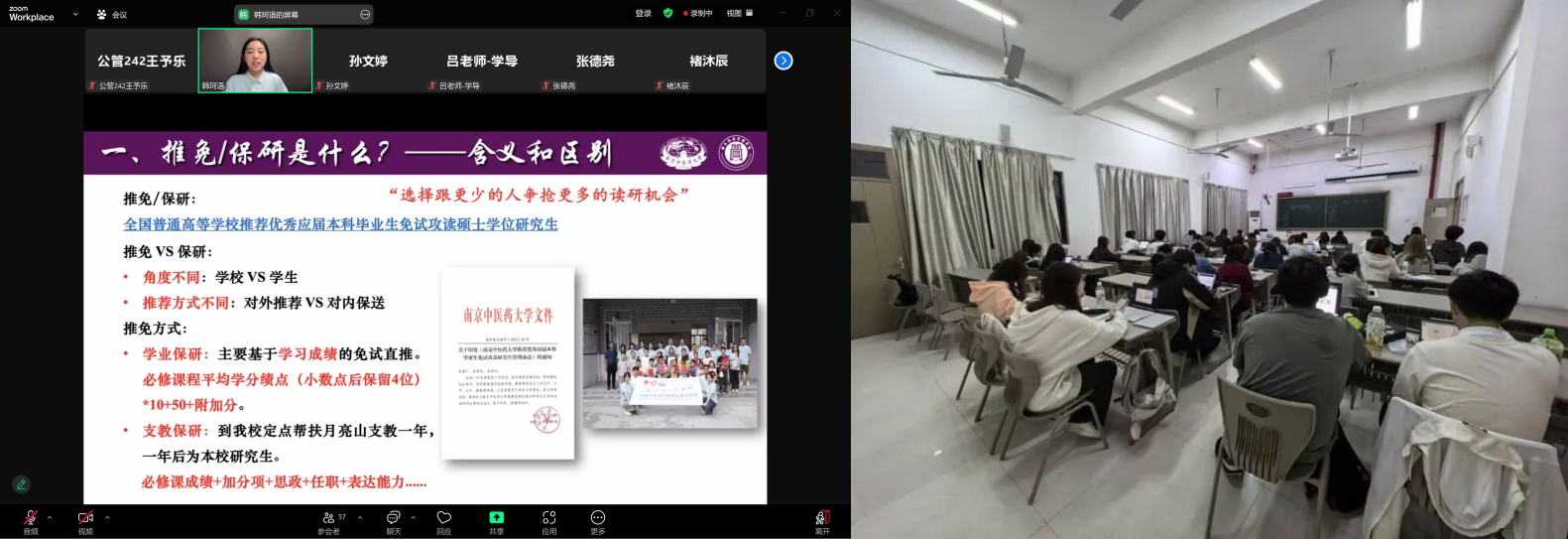 分享会下半场主题为“青衿之志,履践致远”。由韩珂语同学向学弟学妹们分享研究生推免流程及经验。作为公共事业管理专业(中澳合作办学)的优秀学生代表,韩珂语同学凭借持之以恒的踏实努力,已成功被北京协和医学院(清华大学医学部)录取为直博生。韩珂语同学结合亲身经历,毫无保留地向同学们分享了本科阶段学习的宝贵经验和心得。她向大家展示了自己每日制定执行的学习计划清单,强调自律的重要性以及如何在学习过程中设定并实现一个个小目标。此外,她还传授了应对困难和战胜焦虑情绪的小技巧,倾情助力学弟学妹们不断超越自我。在互动环节,同学们积极向韩珂语同学请教,并获得了很多非常接地气的有效建议。韩珂语同学娓娓道来的奋斗学习经历,极大鼓舞了与会同学们,他们纷纷表示要向韩珂语学姐看齐,脚踏实地践行“青衿之志”。