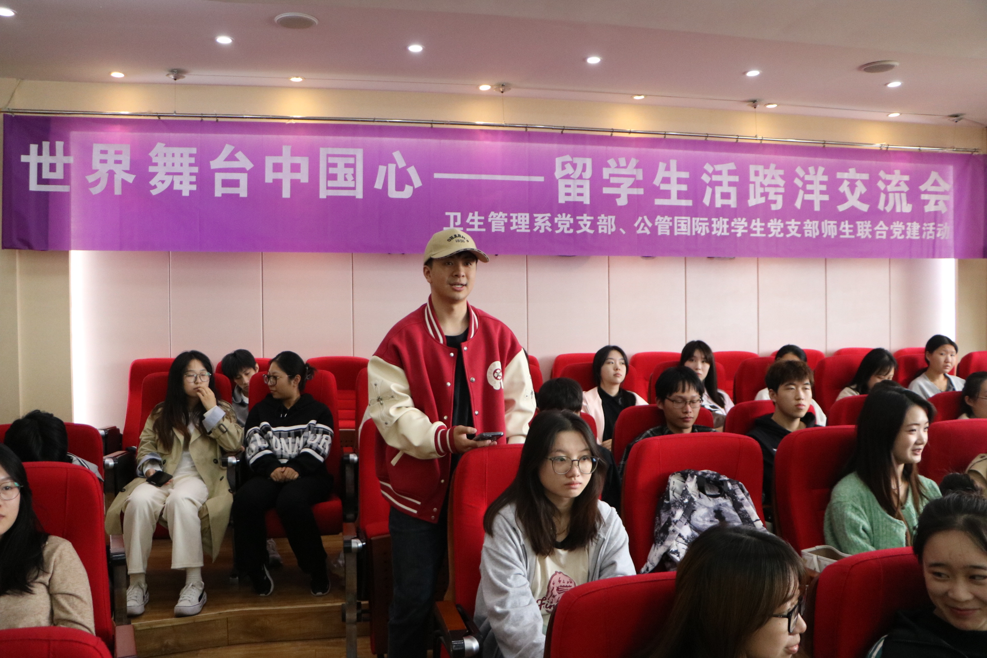 2024年10月10日中午,卫生管理系教师党支部与公共管理国际班学生党支部于B11-414会议室共同举办“世界舞台中国心——留学生活跨洋交流会”党建共建主题党日活动,学院党委书记王红云以支部普通党员身份参加了此次活动,公共管理系教师党支部书记沈秋欢老师主持本次交流。