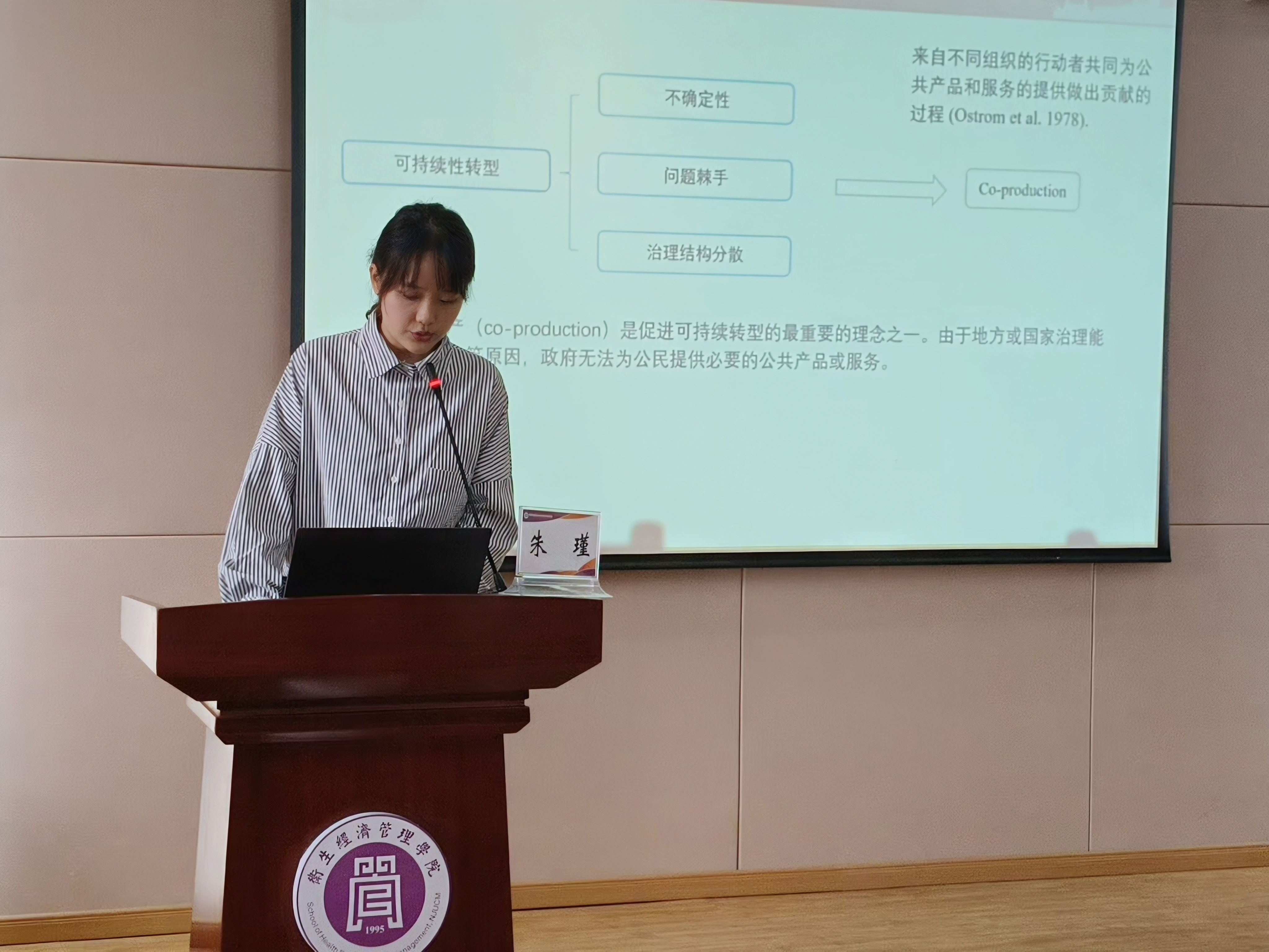 朱瑾博士以《可持续性转型的合作生产—来自两个城市的案例启示》为题,通过“可持续性转型的合作生产相关文献分析”“水质管理的合作生产——基于香港水质政策的案例分析”“基层治理中的居民环境合作生产——基于中国东部J区的案例分析”三个板块,向与会师生分享政策的关键行动者对合作生产贡献、基层治理中社区干部和公众互动对公众环境合作生产的影响等研究成果,并与参会师生开展讨论互动。